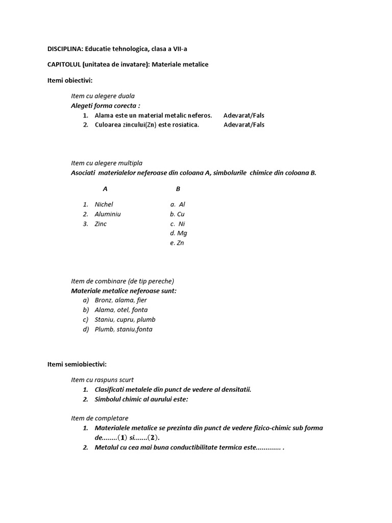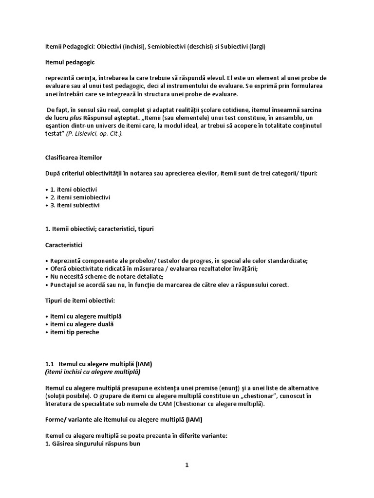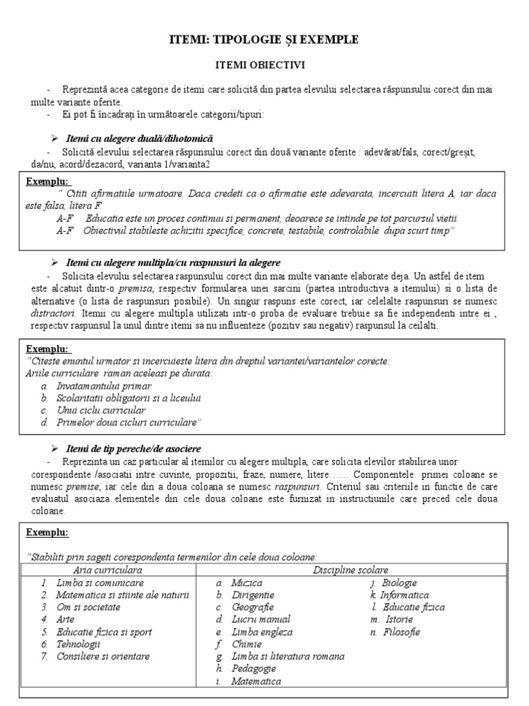 Itemi cu alegere multipla. Răspunsul elevului este limitat ca formă spańiu sau conńinut prin natura sarcinii de lucru. Referatul a fost prezentat la un curs in facultate unde ni s au cerut exemple concrete pentru fiecare tip de item in parte. Itemi cu alegere duală itemii cu alegere duală solicită elevului să selecteze unul din 2 sau mai multe răspunsuri posibile.