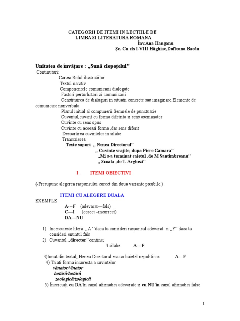 Itemii de tip da nu si adevărat fals sunt cel mai frecvent folositi. învăţământ primar limba şi literatura român ă. Itemi cu răspuns scurt şi de completare presupun formularea de către elev a unui răspuns în totalitatea lui sau doar ca o parte componentă a unei afirmańii incomplete. Itemul cu alegere multiplă presupune existenţa unei premise enunţ şi a unei liste de alternative soluţii posibile.